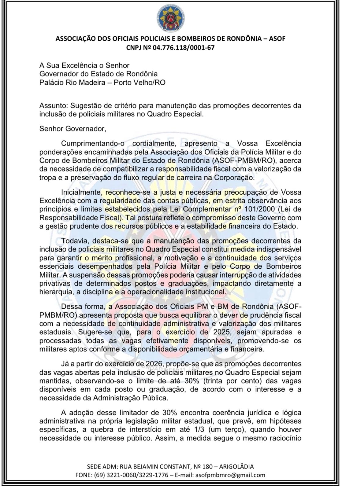 Cumprimentando-o cordialmente, apresento a Vossa Excelência ponderações encaminhadas pela Associação dos Oficiais da Polícia Militar e do Corpo de Bombeiros Militar do Estado de Rondônia (ASOF-PMBM/RO), acerca da necessidade de compatibilizar a responsabilidade fiscal com a valorização da tropa e a preservação do fluxo regular de carreira na Corporação.